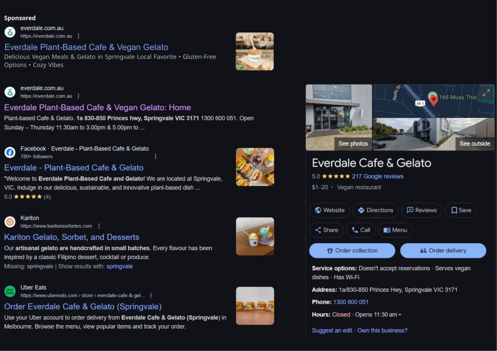 - Google Ads: Branded and high-intent keywords like “best vegan café Springvale.”